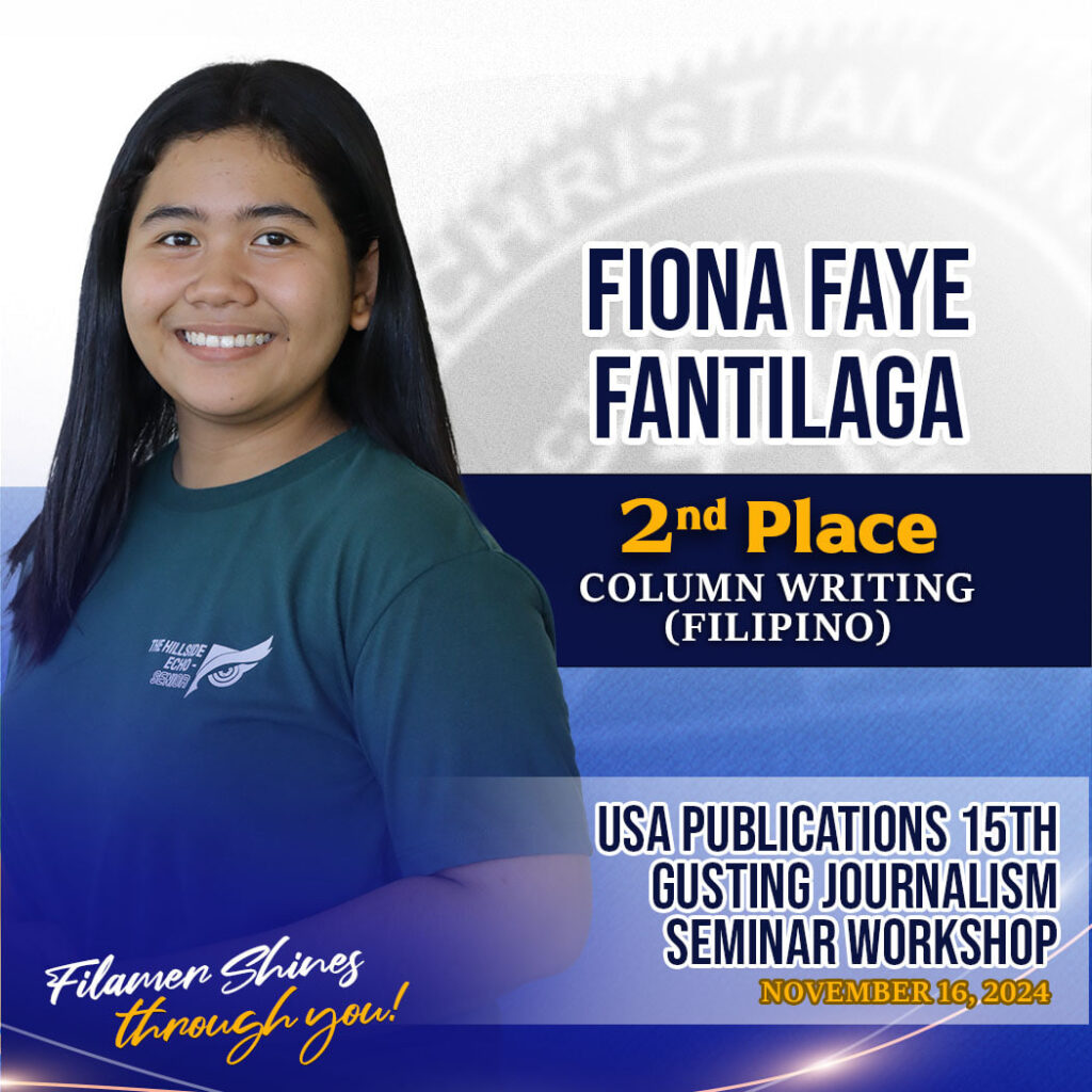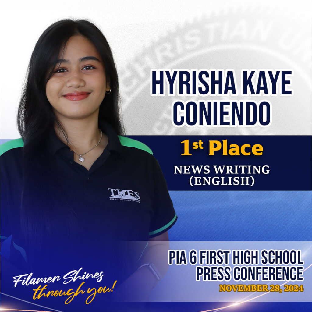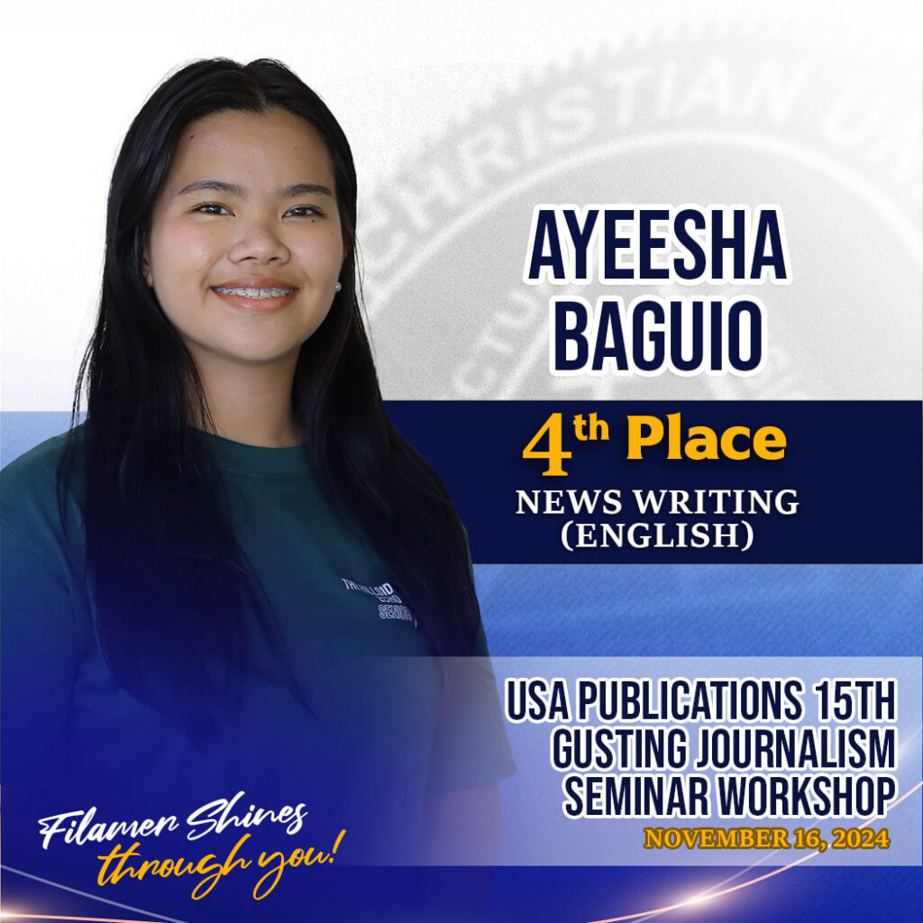 Five distinctions were accumulated by the student journalists in their inaugural participation in the event: Hyrisha Kaye Coniendo, Second Place in English Sports Writing; Geomarie Dave Centillo, Second Place in English Column Writing; Fiona Faye Fantilaga, Second Place in Filipino Column writing; Ayeesha Baguio, Fourth Place in English News Writing; and Candie Villar, Fourth Place in Digital Arts.