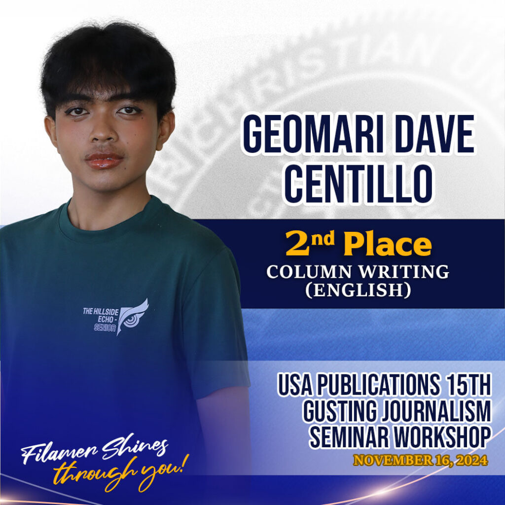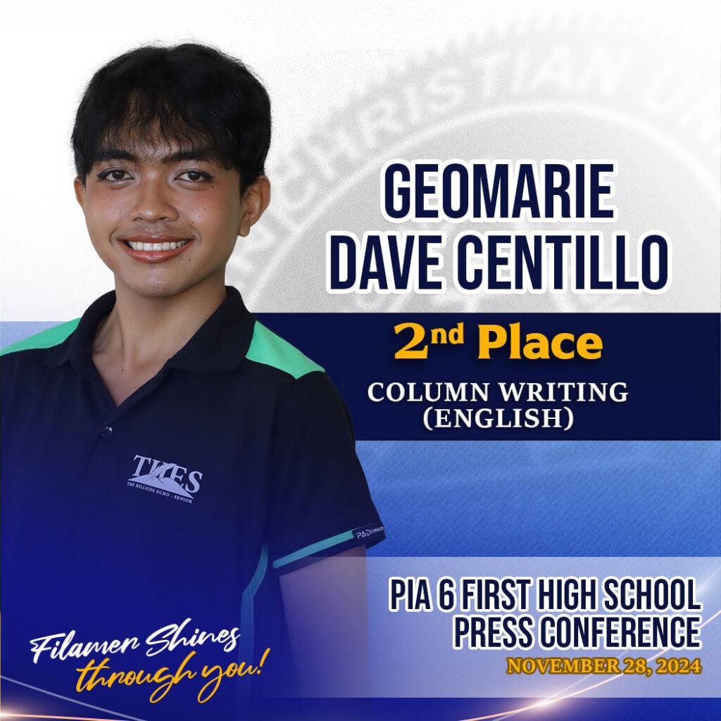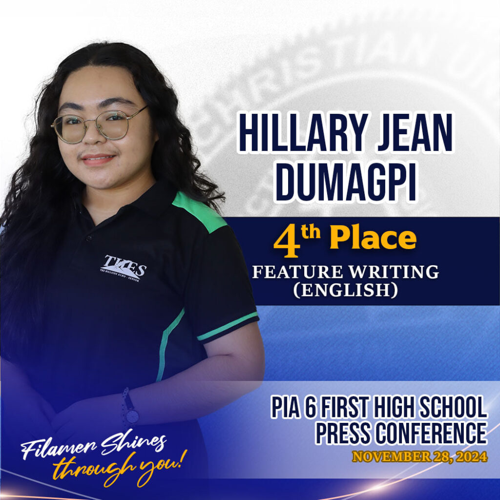 Five distinctions were accumulated by the student journalists in their inaugural participation in the event: Hyrisha Kaye Coniendo, Second Place in English Sports Writing; Geomarie Dave Centillo, Second Place in English Column Writing; Fiona Faye Fantilaga, Second Place in Filipino Column writing; Ayeesha Baguio, Fourth Place in English News Writing; and Candie Villar, Fourth Place in Digital Arts.