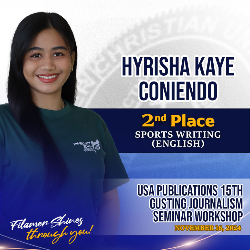 Kyle Laurence Ibañez claimed two awards as Champion in English Sports writing and Third Place in English News Writing; Ily Serram Delfin, Second Place in Filipino Sports Writing and Third Place in Filipino Column Writing; Aaron Matthew Casugbo, Third Place in English Sports Writing; Ma. Estelle Vaflor, Third Place in Filipino Sports Writing; Vaflor and Ibañez were also recognized as Honorable Mention in Mobile Journalism; while HSE adviser, Michael Jay Demingoy was hailed as First Place in English News Writing and Third Place in English Sports Writing under adviser’s category.